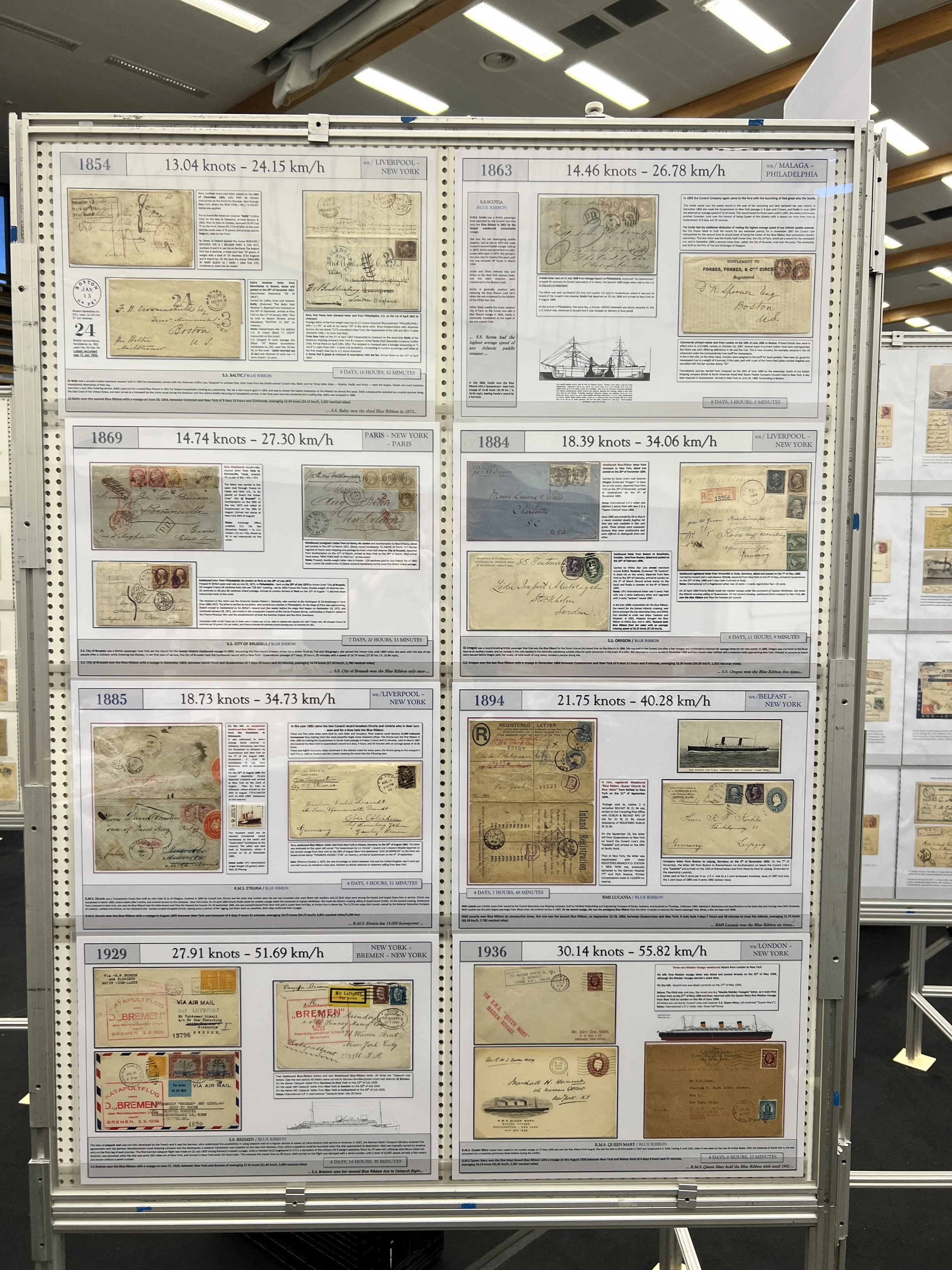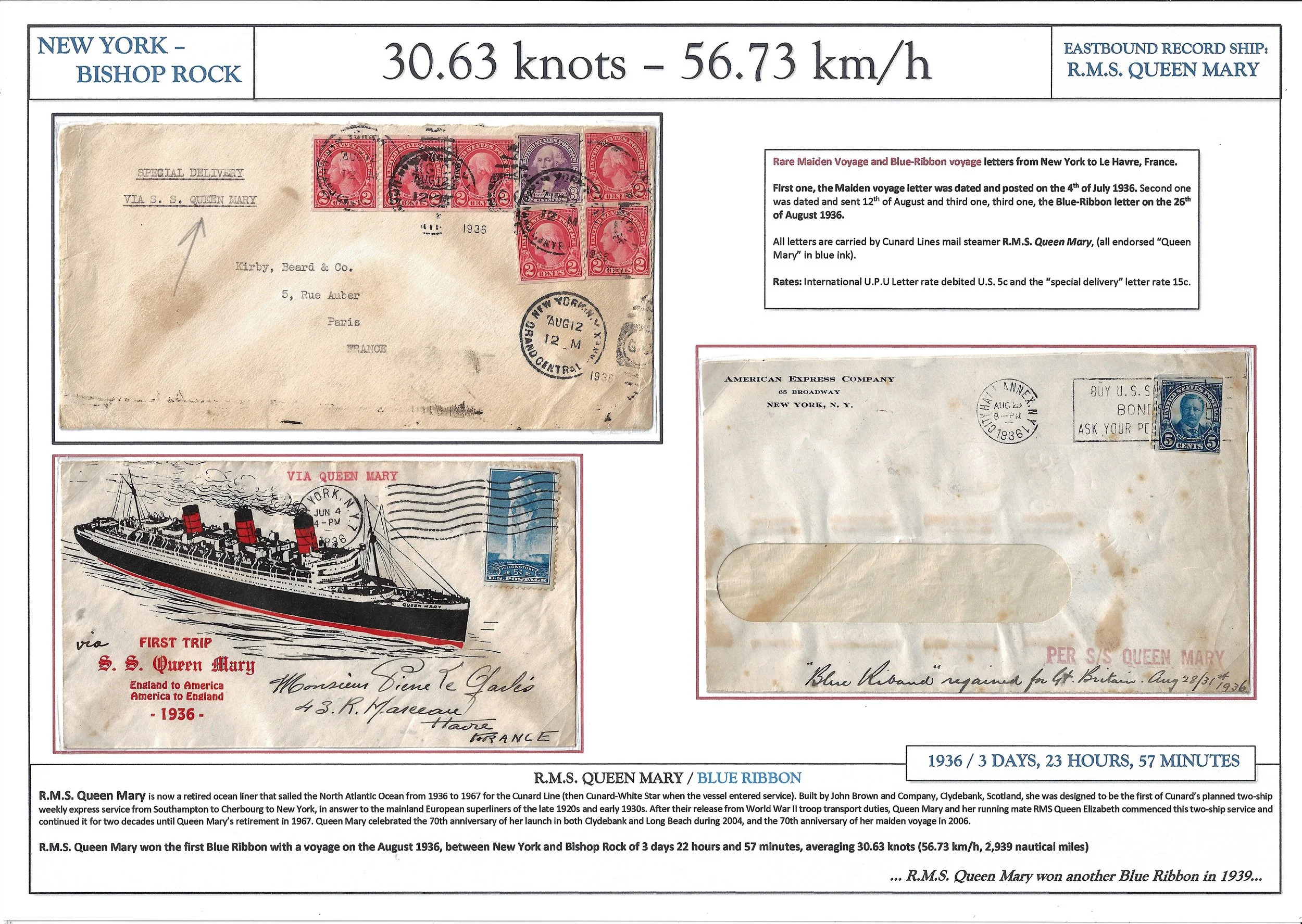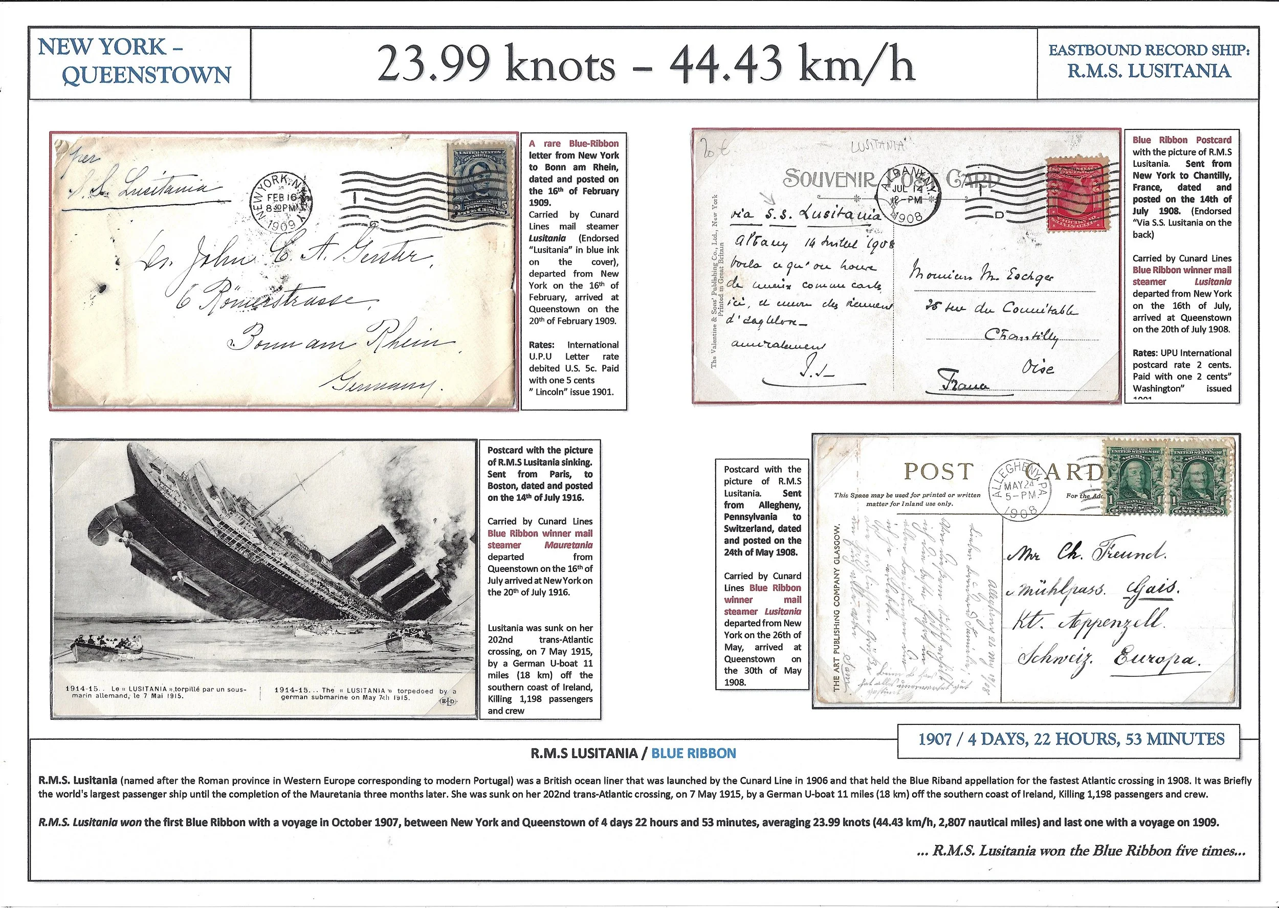 The first "official" Blue Ribbon was reached in 1838 when the steamship Sirius carried the mail across the Atlantic in 18 days and the last in 1952 when Queen Mary crossed the Atlantic in just over three days. The focus of the collection dates to the period before airmail, and especially to the years 1838-1909, when the development of postal transport was the fastest.
