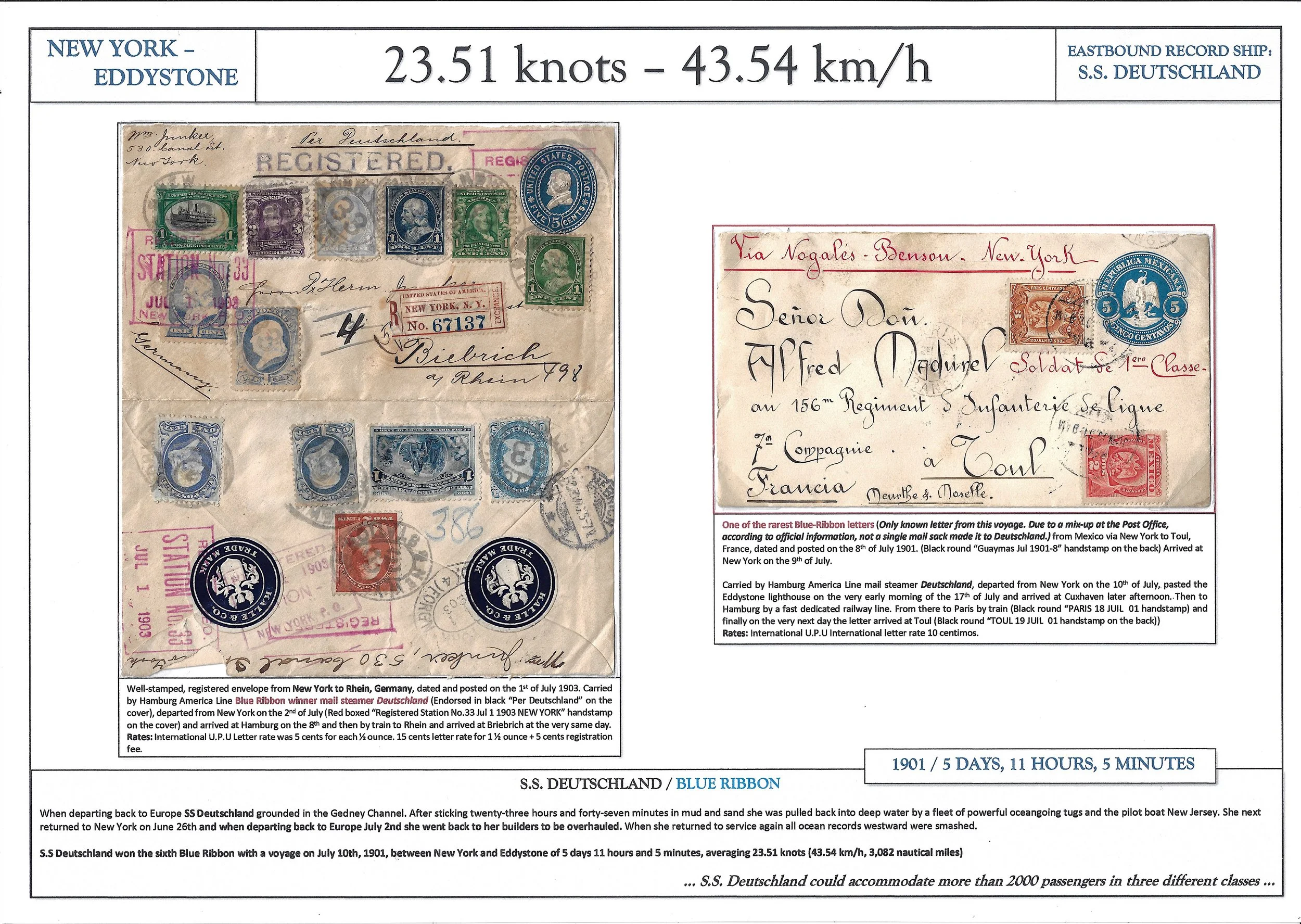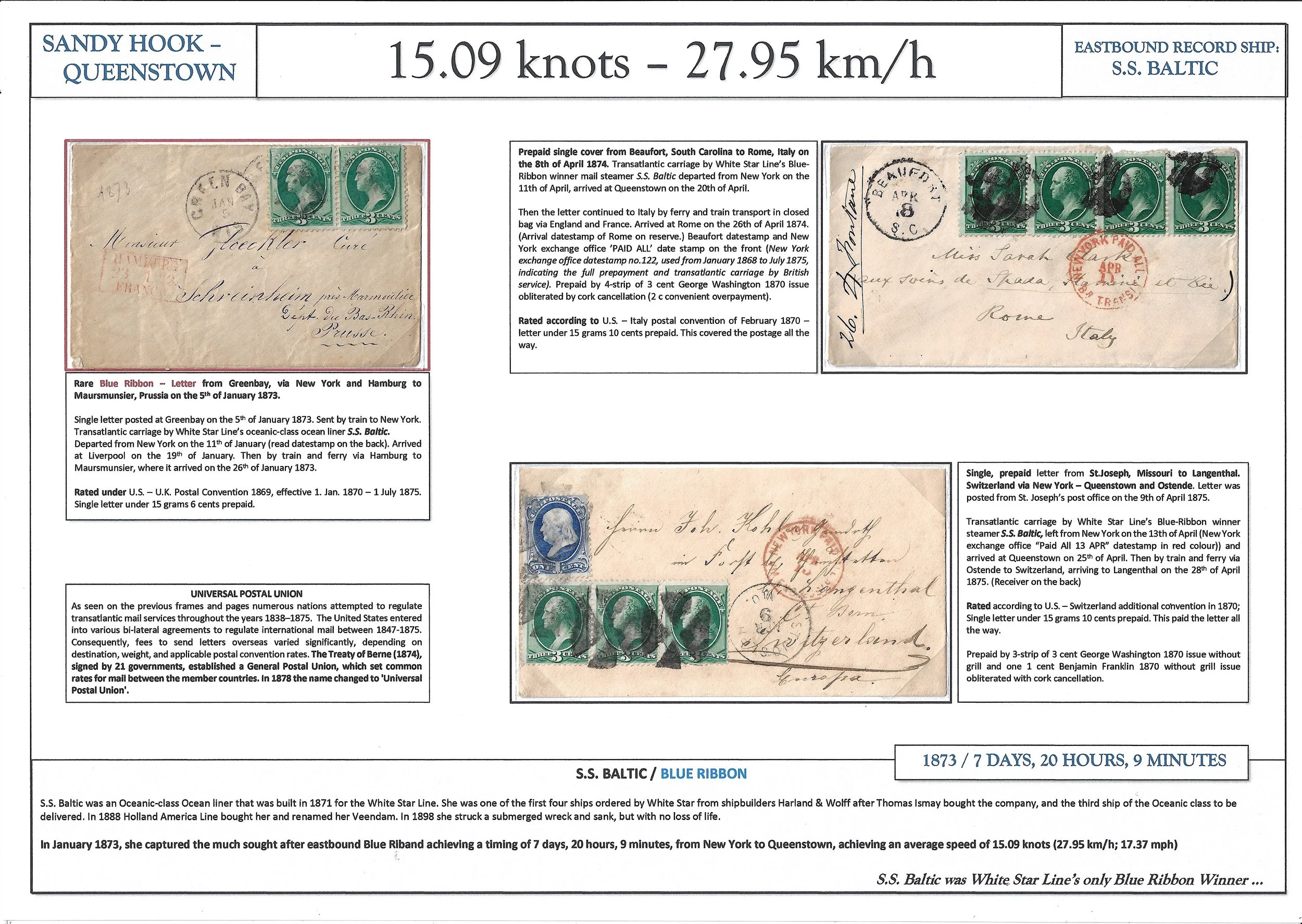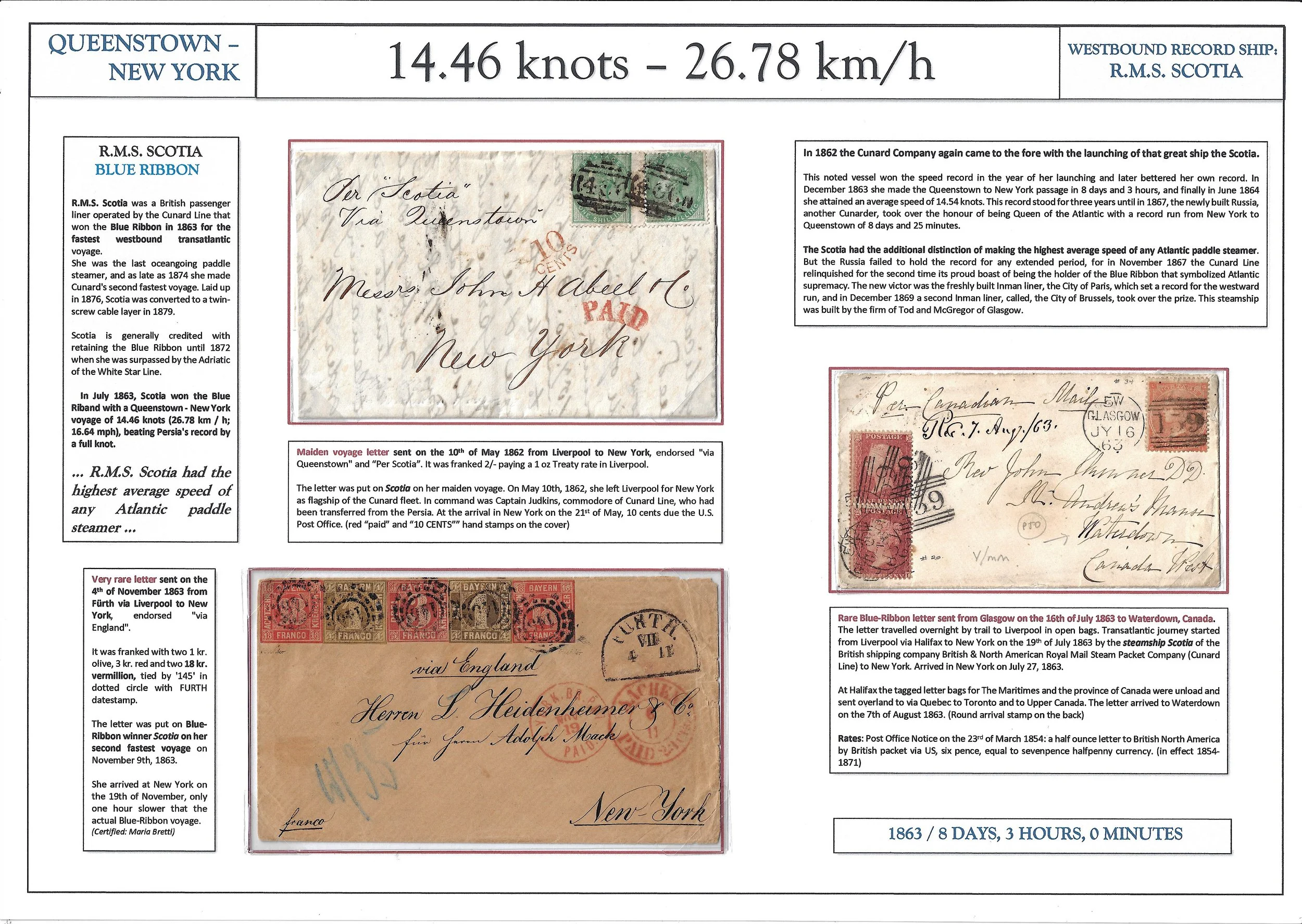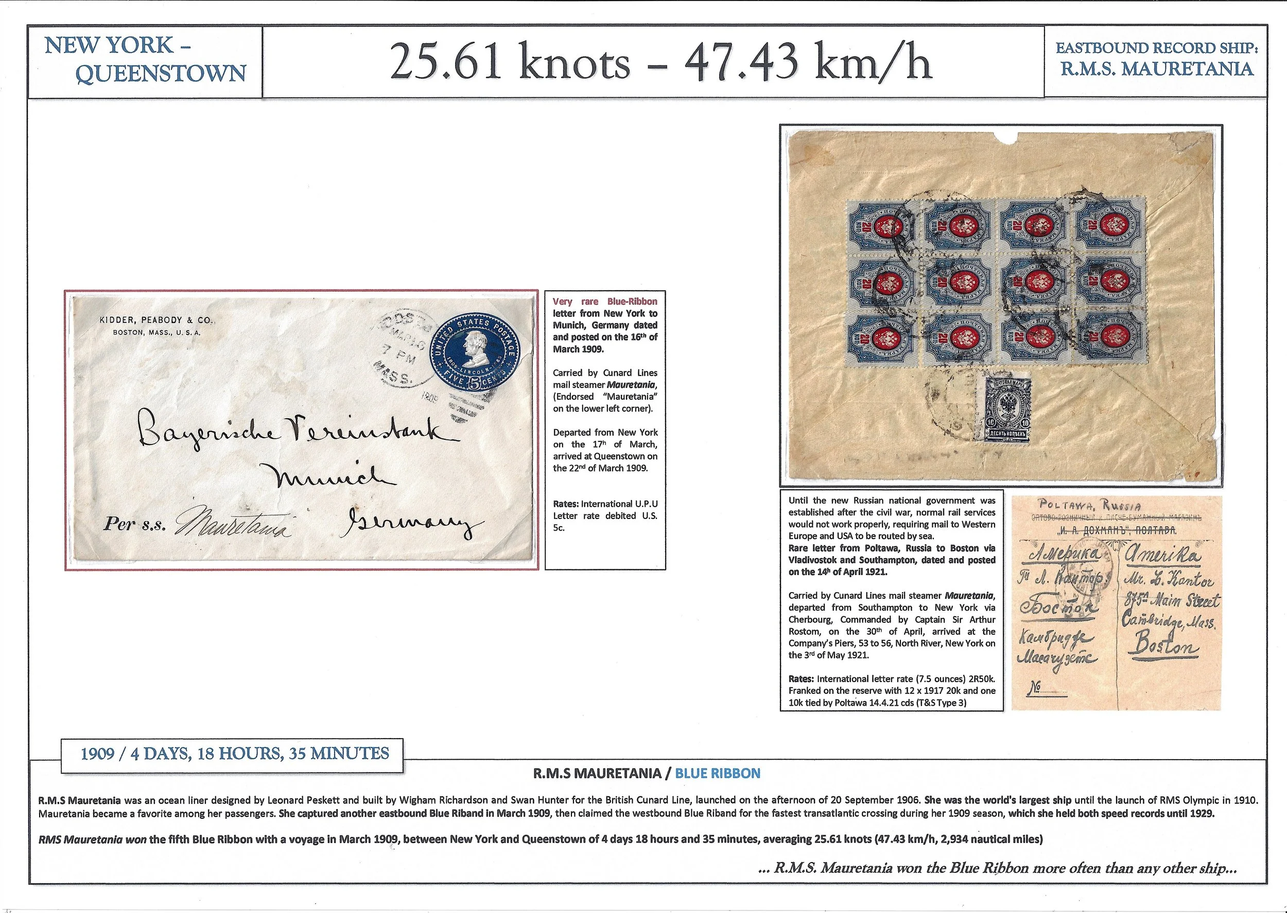 This collection talks about the great change that took place between 1838 and 1952 in Atlantic mail transportation. Collection presents the rapid development of mail transportation from one continent to another through the fastest Atlantic crossings, with a particular focus on Atlantic crossings that achieved the Blue-Ribbon. The collection contains many particularly rare items, including over 60 rare "Blue Ribbon" letters and Maiden Voyage letters.