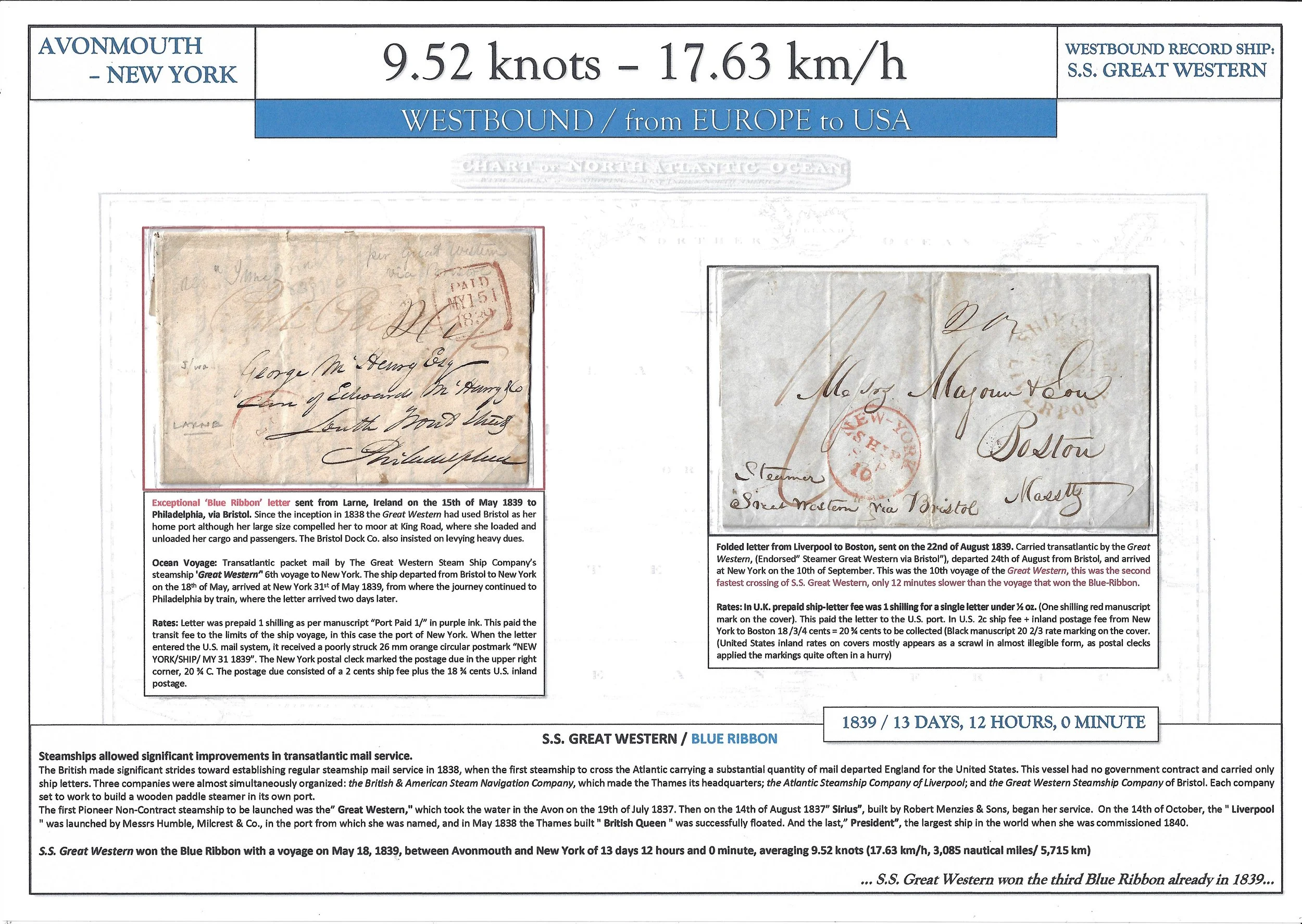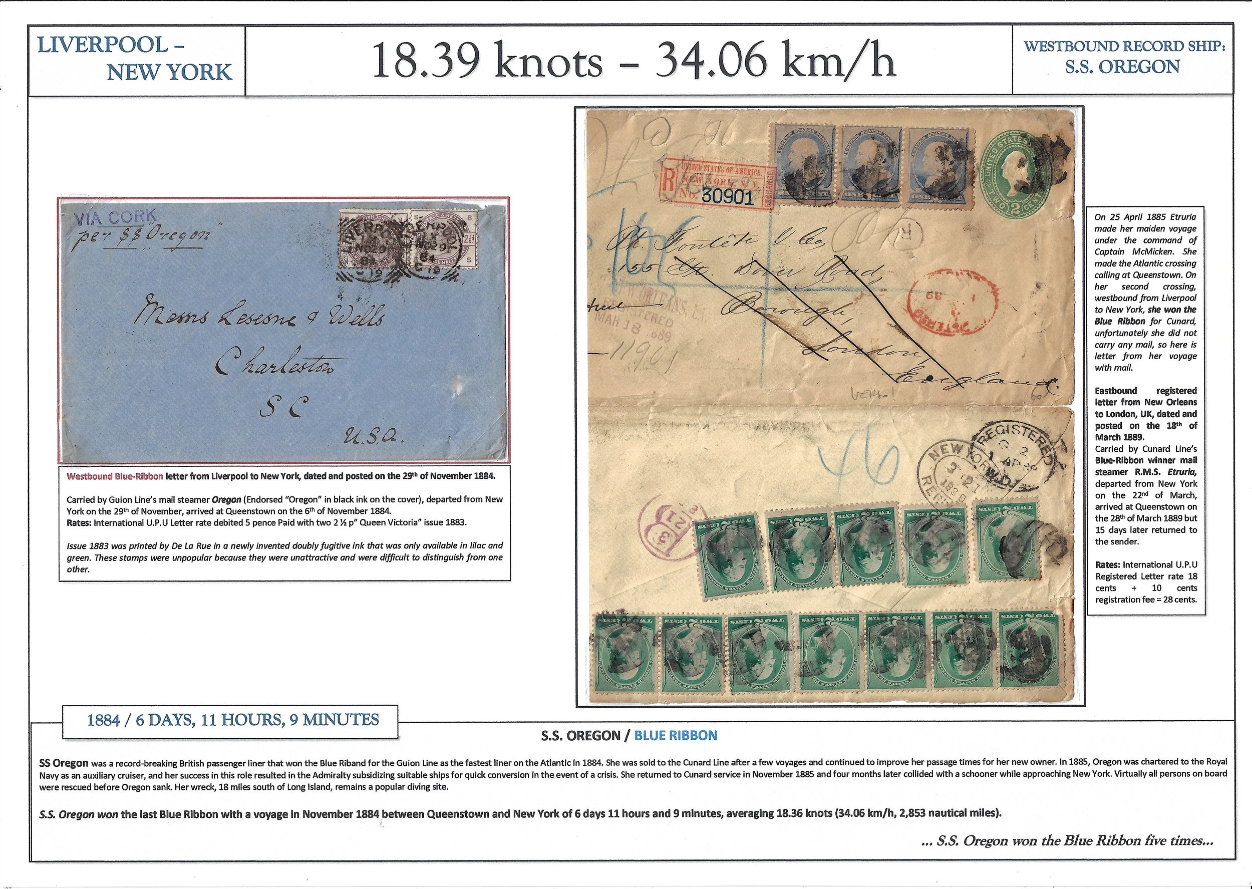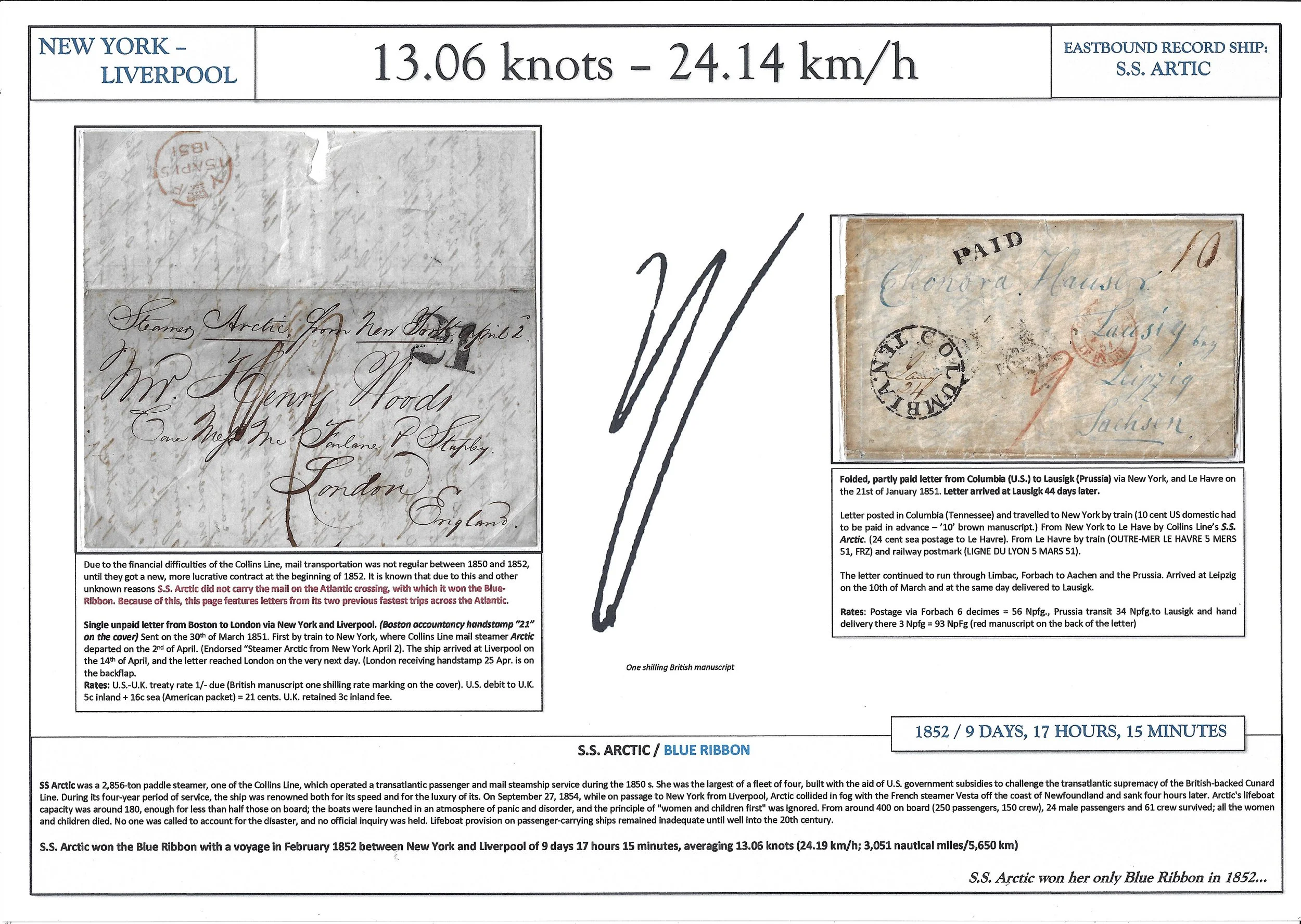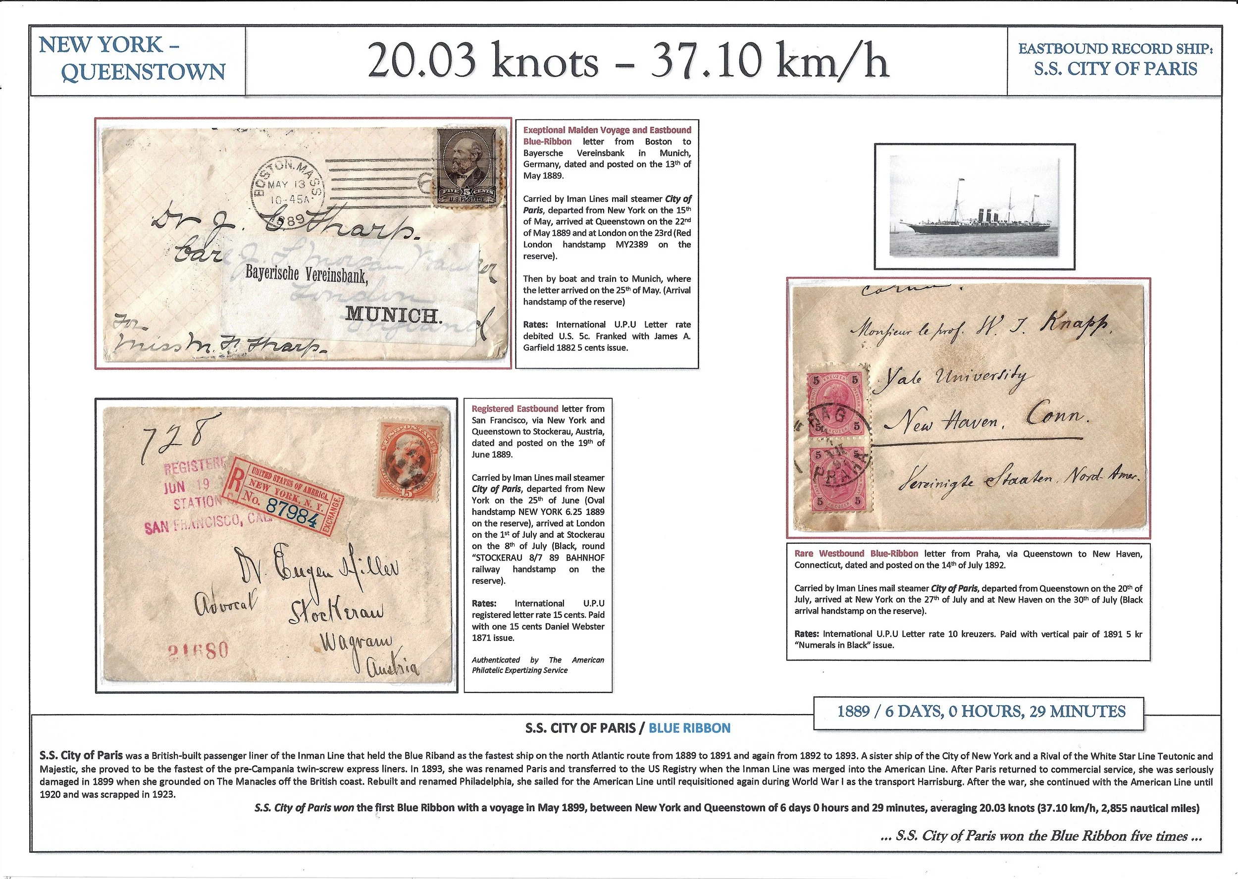 This collection talks about the great change that took place between 1838 and 1952 in Atlantic mail transportation. Collection presents the rapid development of mail transportation from one continent to another through the fastest Atlantic crossings, with a particular focus on Atlantic crossings that achieved the Blue-Ribbon. The collection contains many particularly rare items, including over 60 rare "Blue Ribbon" letters and Maiden Voyage letters.