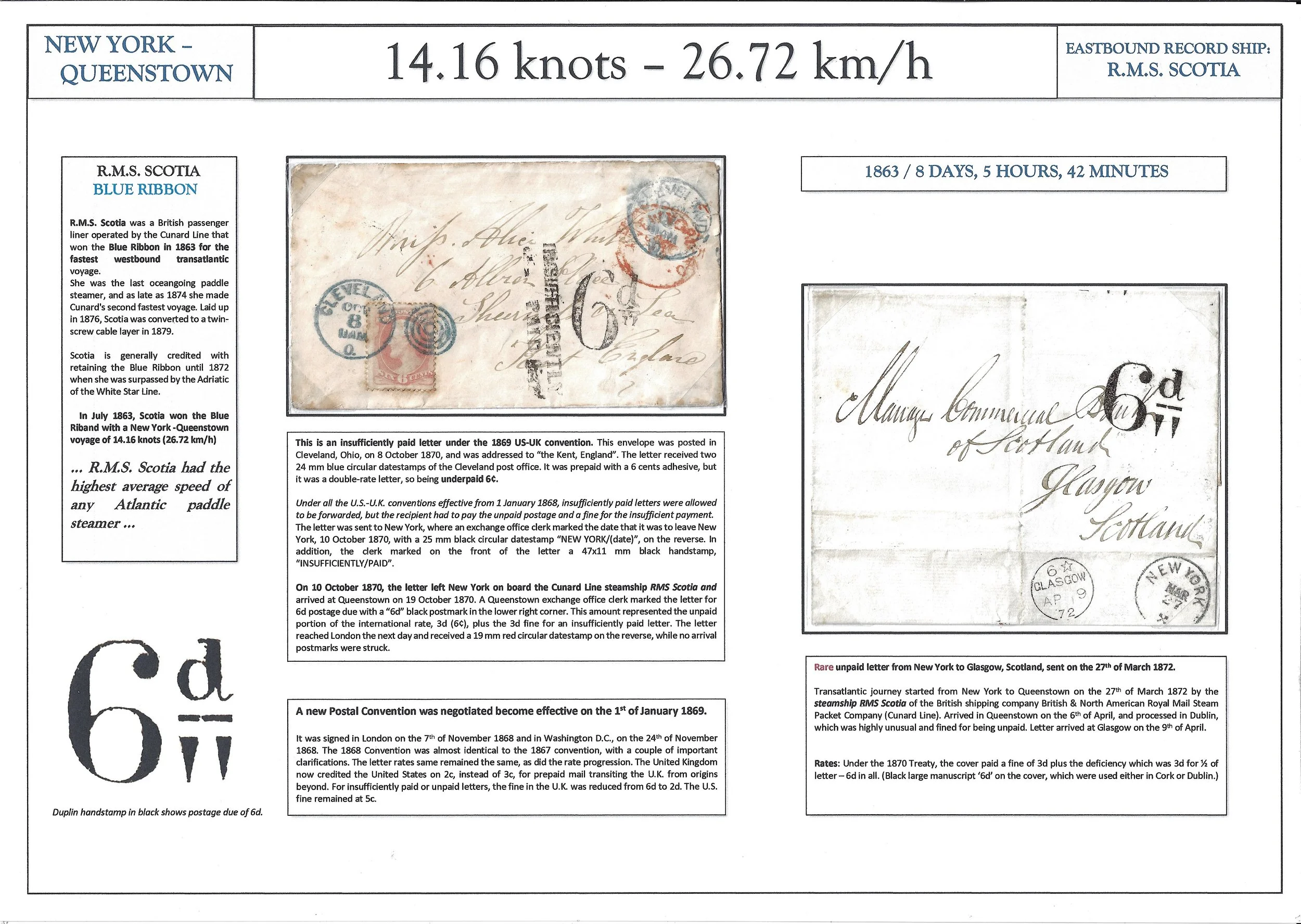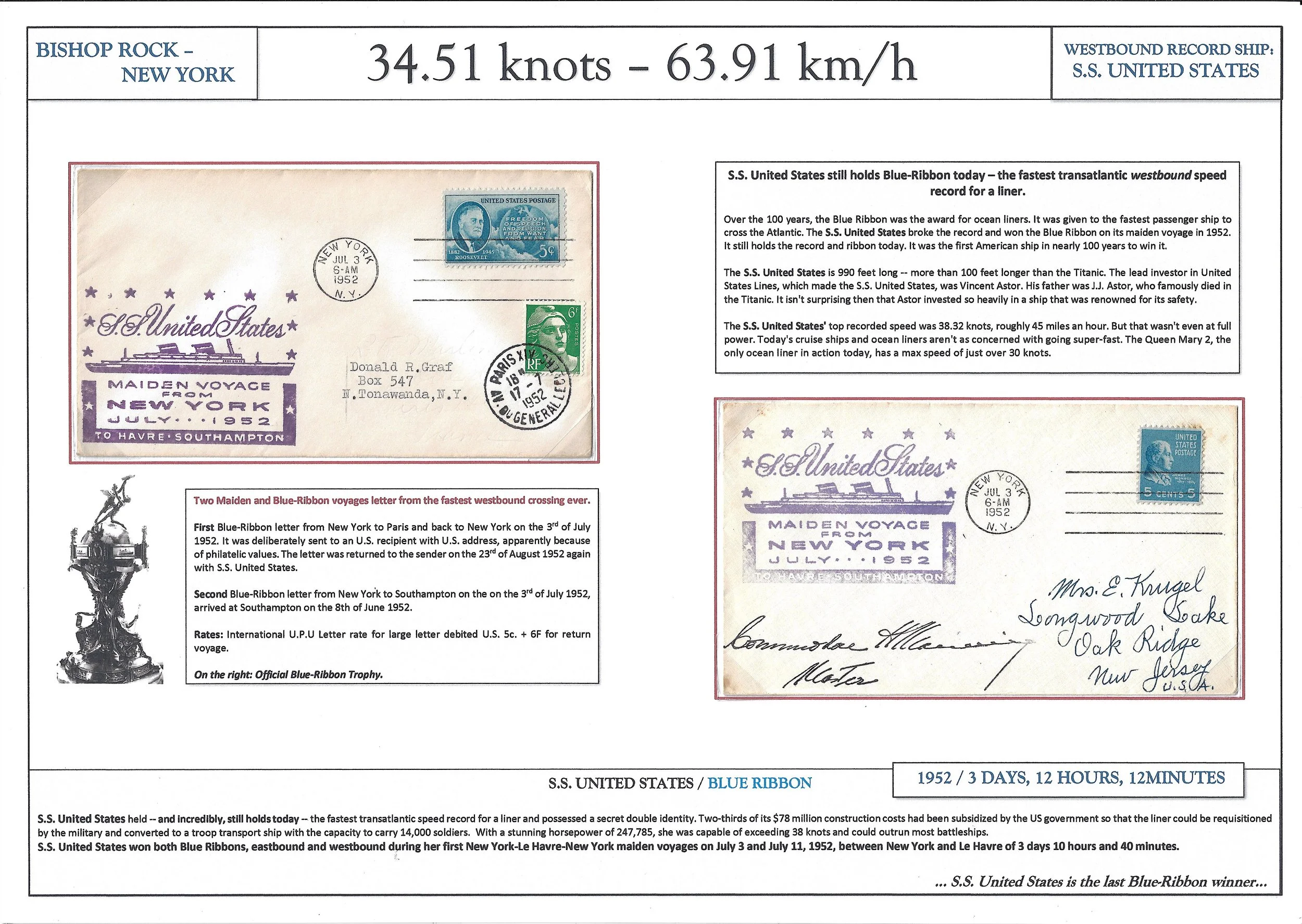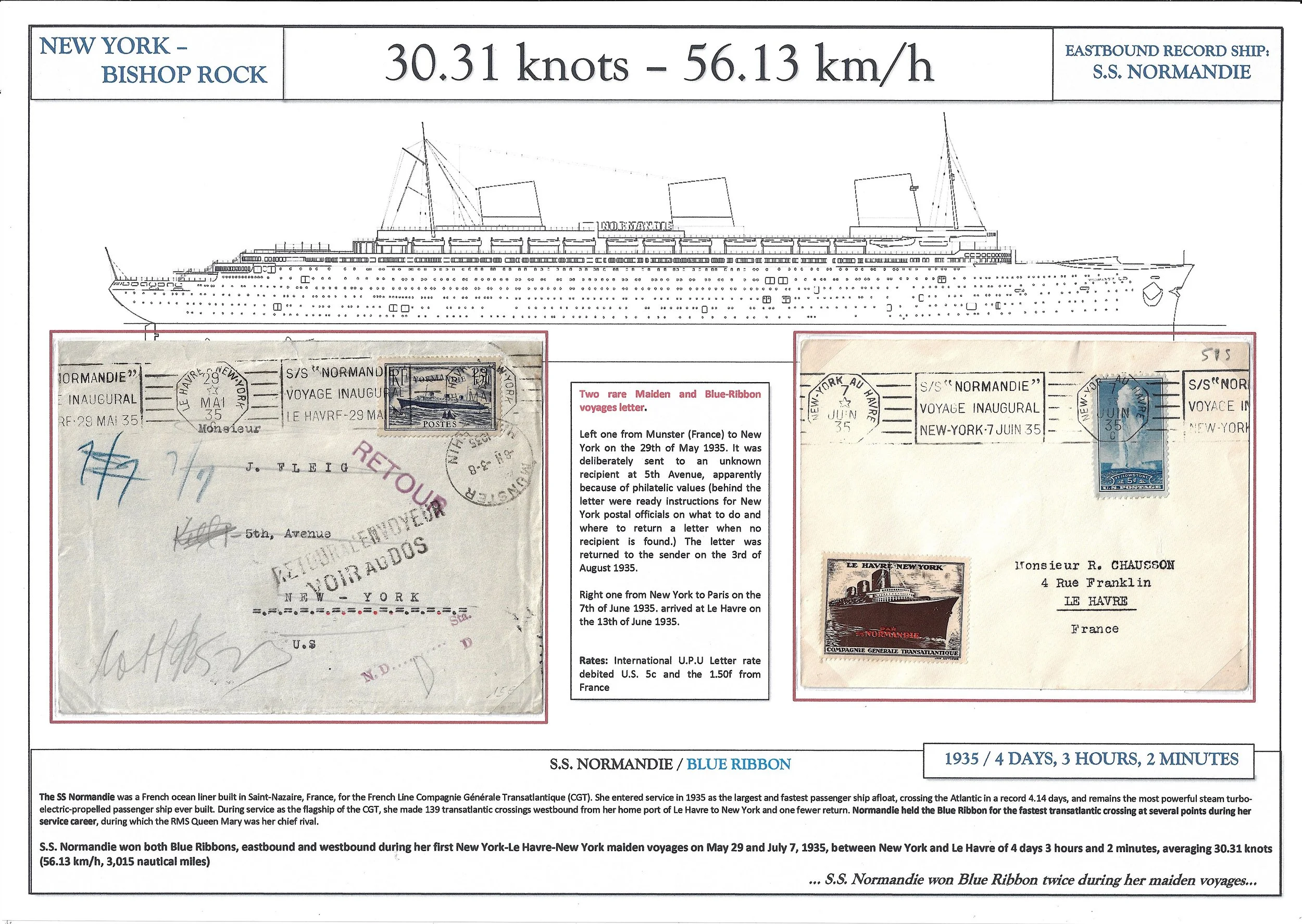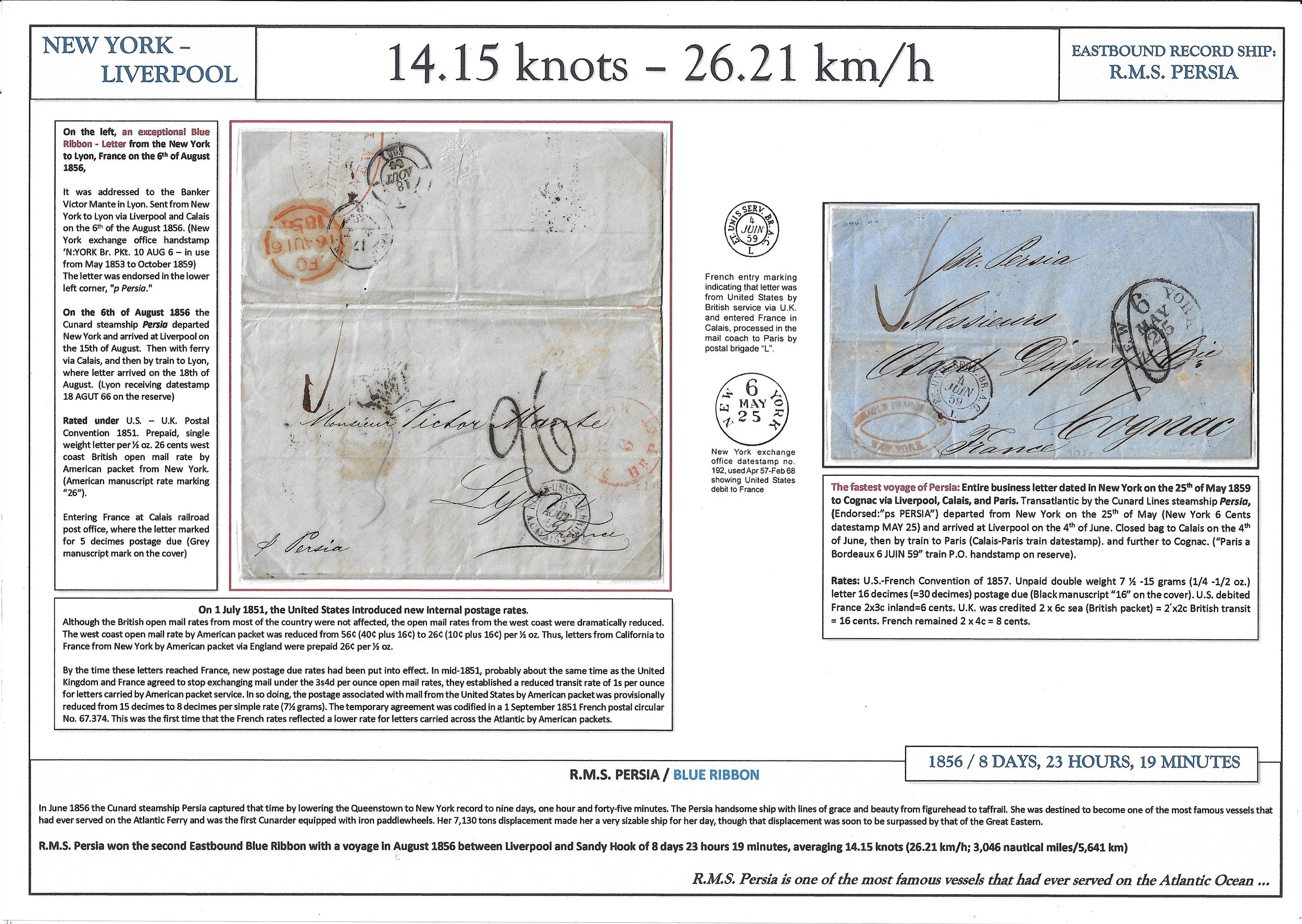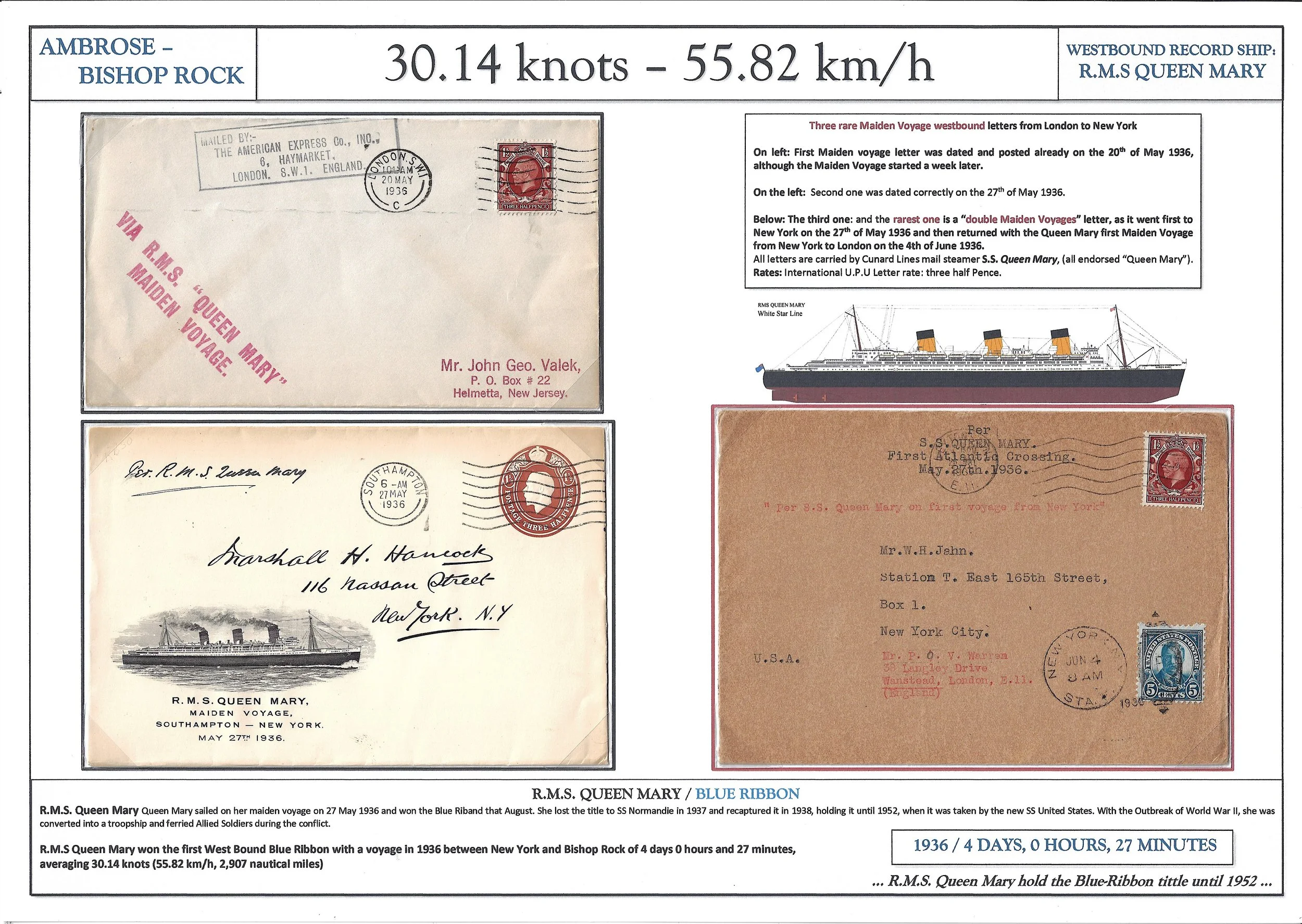 This collection talks about the great change that took place between 1838 and 1952 in Atlantic mail transportation. Collection presents the rapid development of mail transportation from one continent to another through the fastest Atlantic crossings, with a particular focus on Atlantic crossings that achieved the Blue-Ribbon. The collection contains many particularly rare items, including over 60 rare "Blue Ribbon" letters and Maiden Voyage letters.