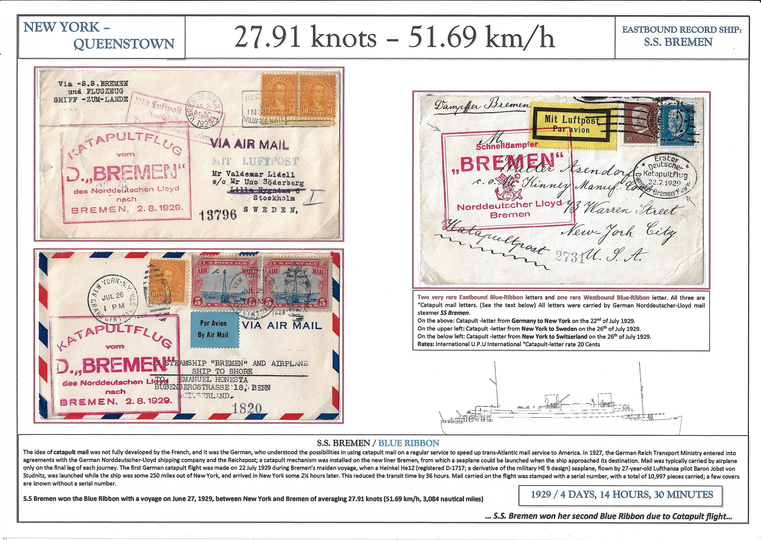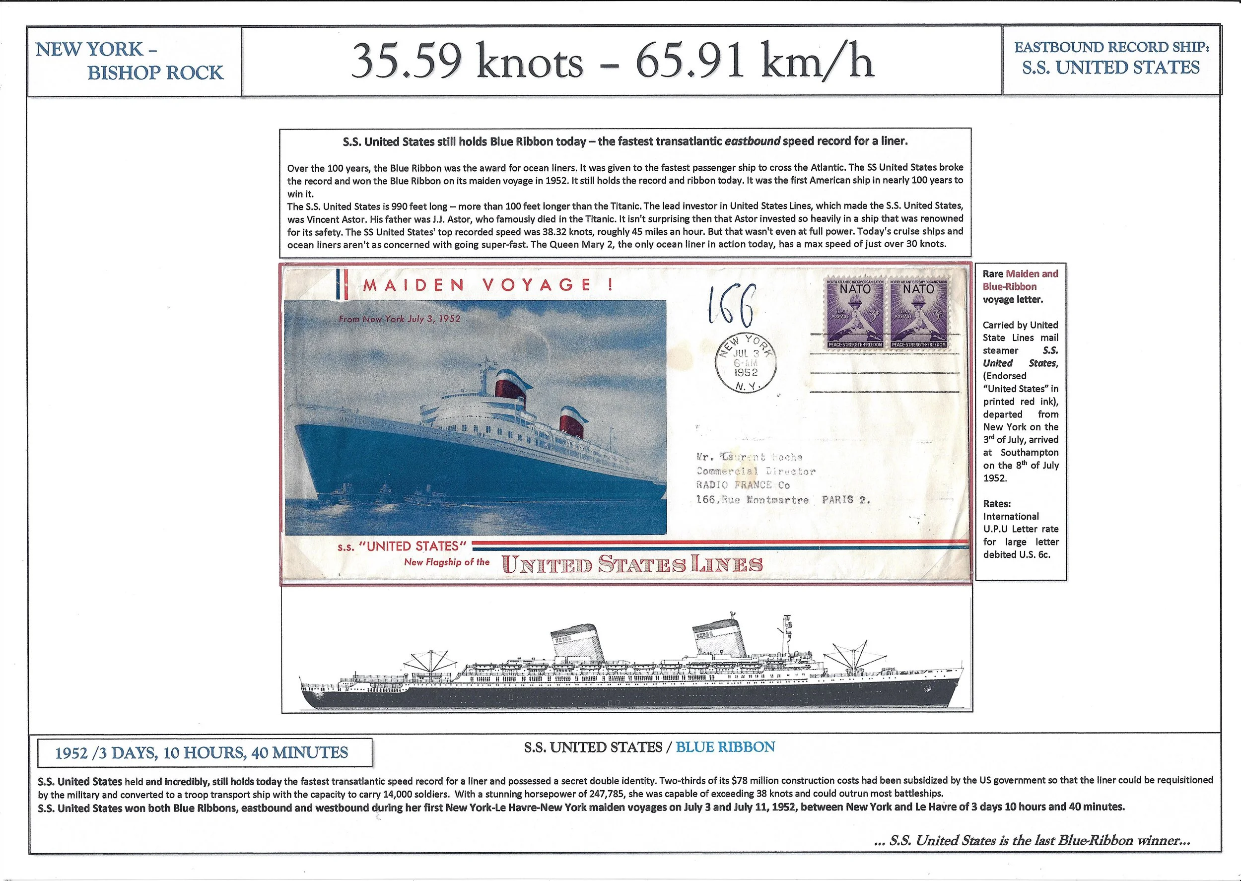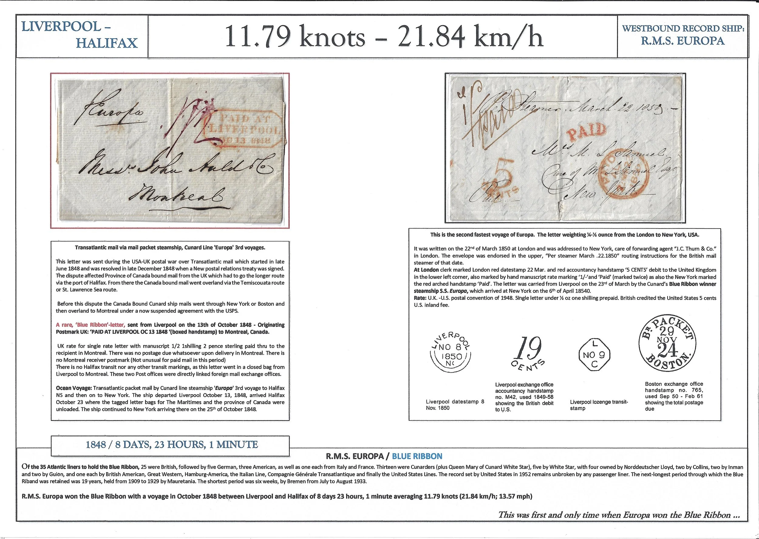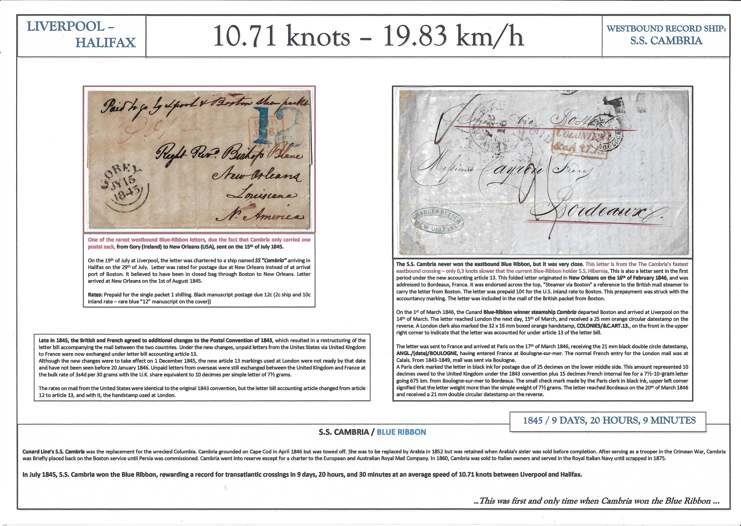 This collection talks about the great change that took place between 1838 and 1952 in Atlantic mail transportation. Collection presents the rapid development of mail transportation from one continent to another through the fastest Atlantic crossings, with a particular focus on Atlantic crossings that achieved the Blue-Ribbon. The collection contains many particularly rare items, including over 60 rare "Blue Ribbon" letters and Maiden Voyage letters.