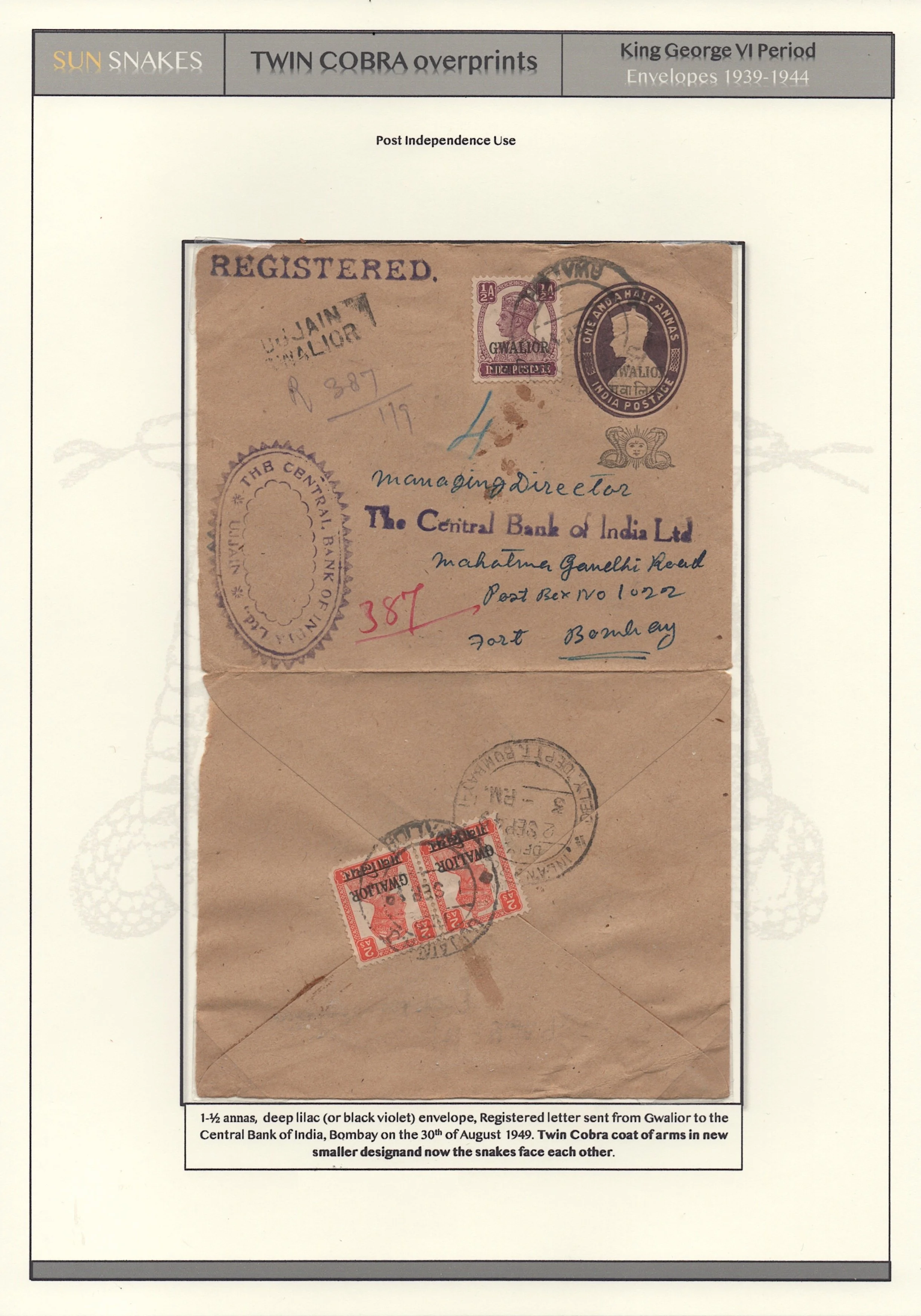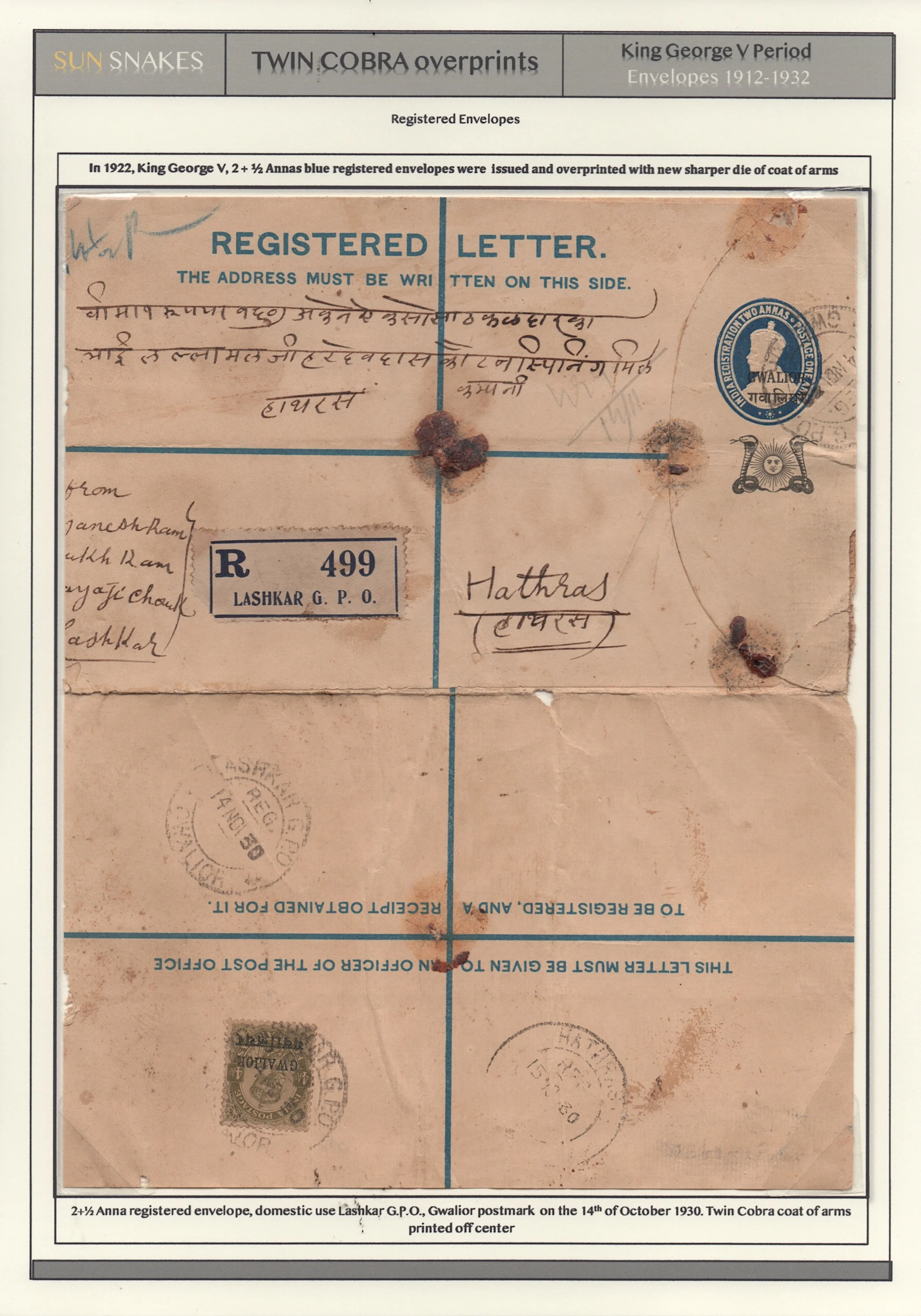 The two cobras and Sun motif was common in Gwalior. It refers to the legend that the founder of the ruling dynasty of Gwalior, when an infant, was left in the sun. Two cobras, recognizing the child's importance, came and spread their hoods to shade and protect him. You may just be able to make out the two cobras again near the top of the Lashkar postmark. (Lashkar was the main town in Gwalior.)